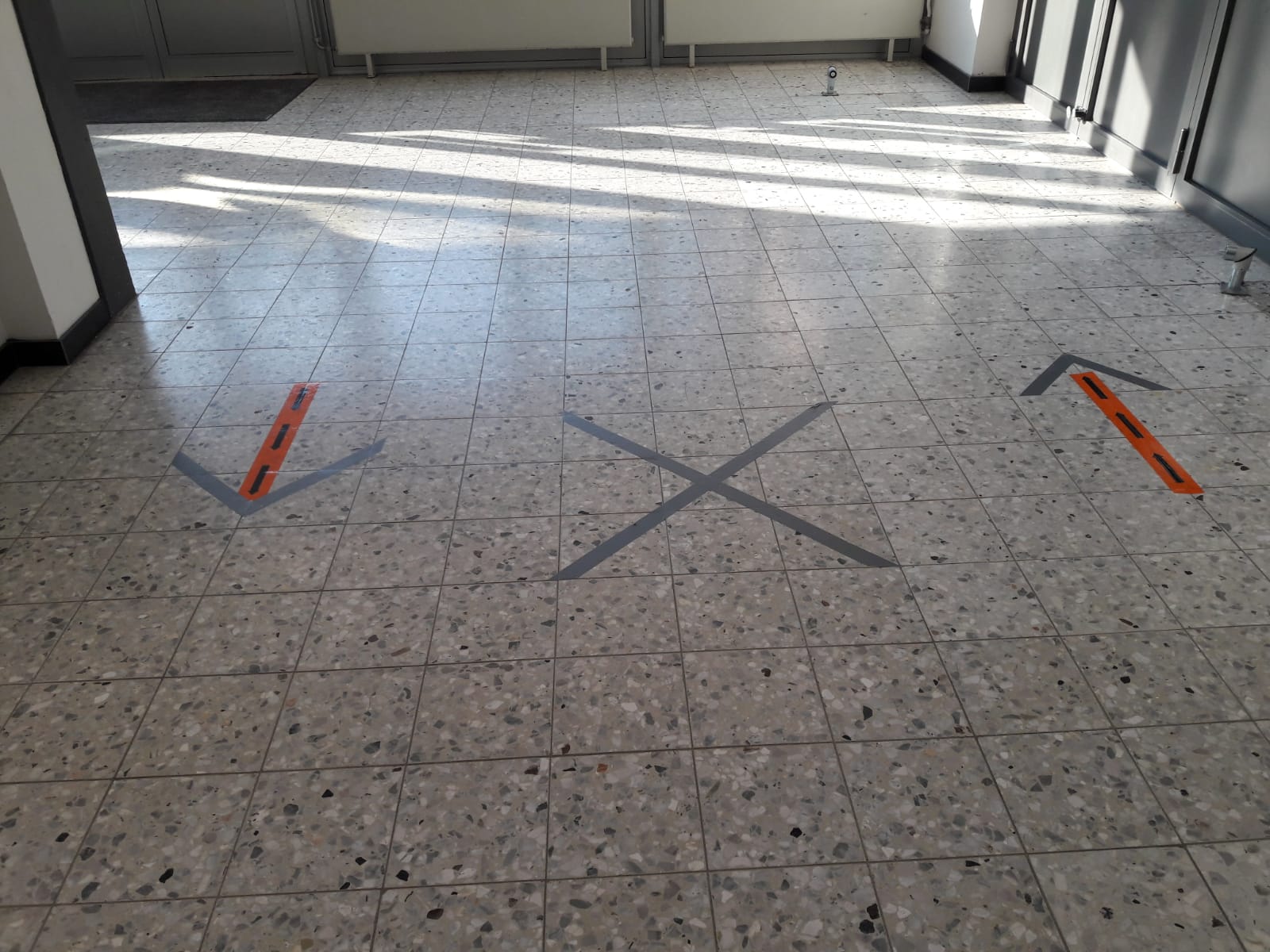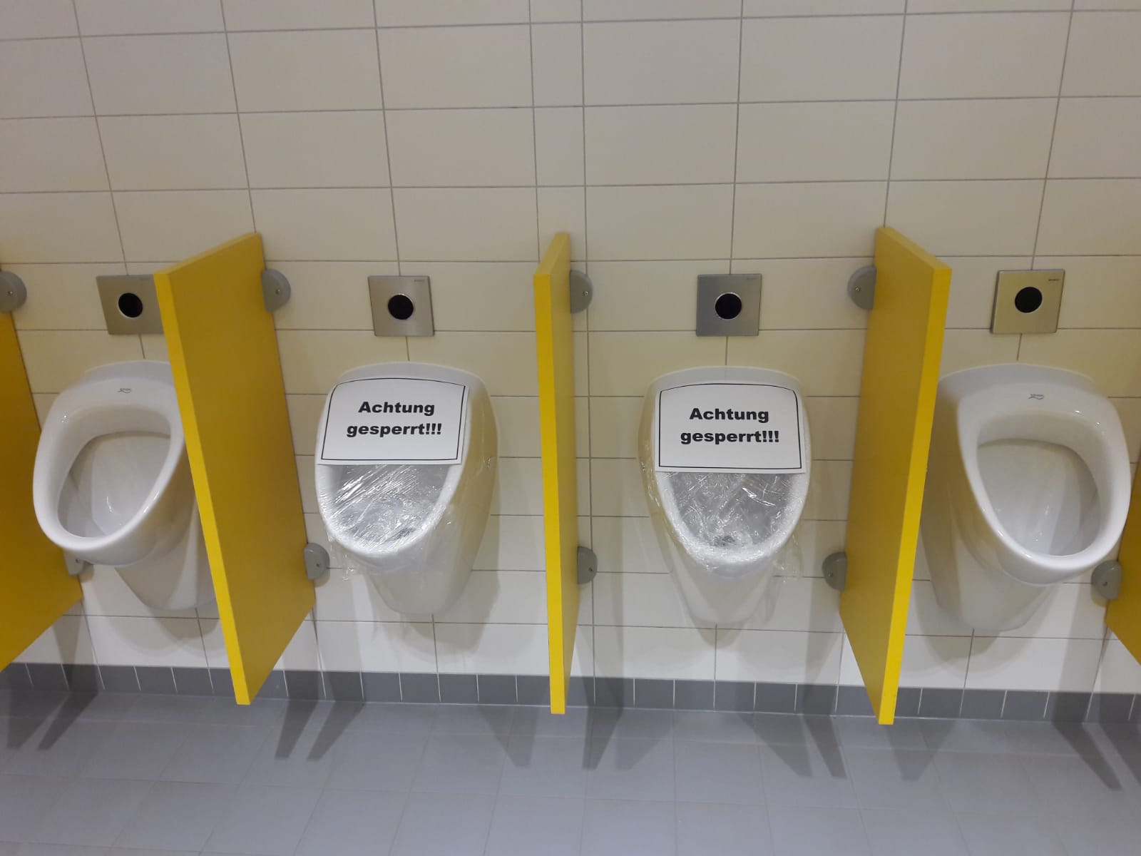 Auf den Fluren in Pfeilrichtung gehen, keiner geht in der Mitte. | In die Toilettenräume gehen aktuell max. zwei Schüler/innen. |