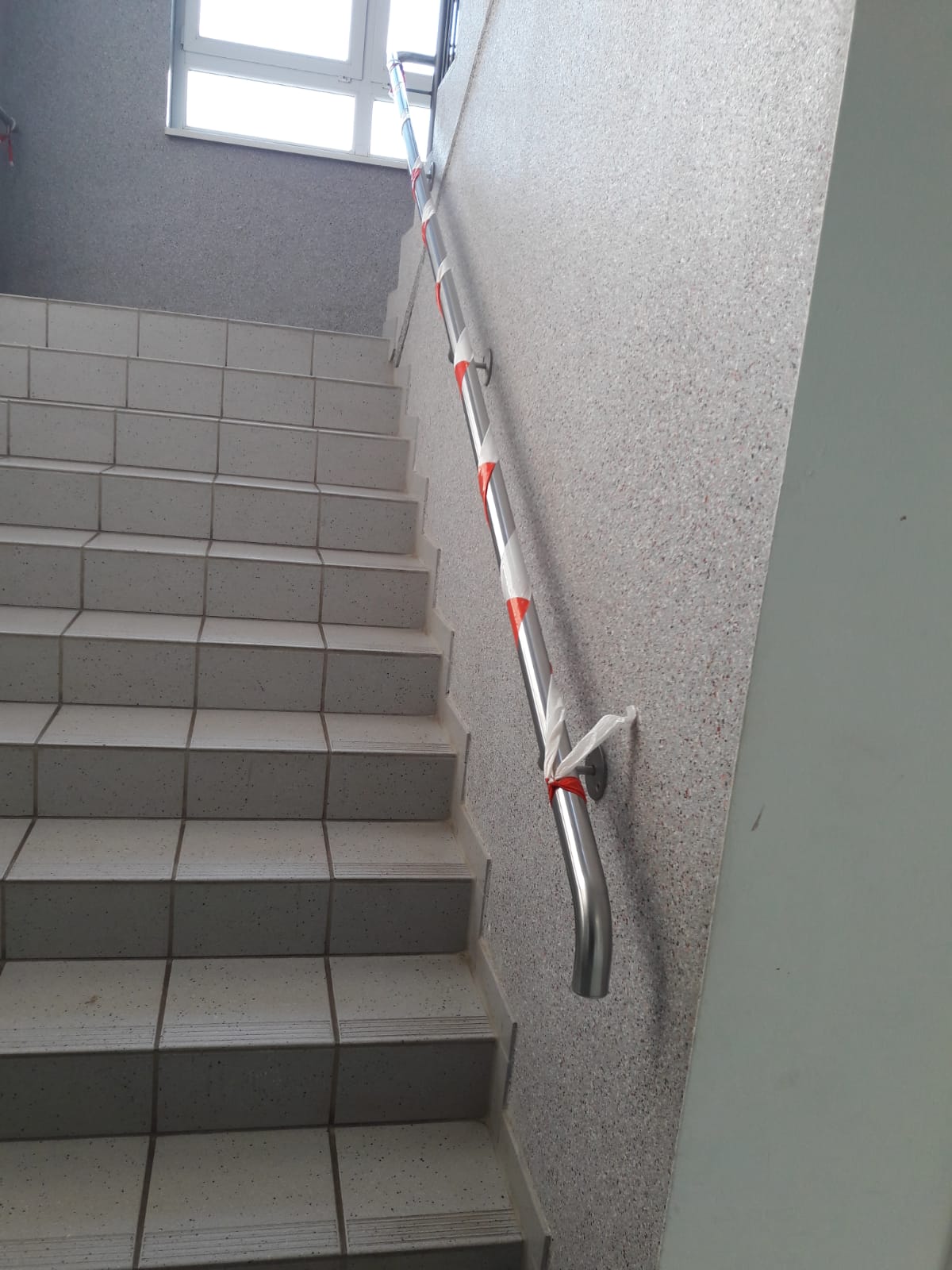 Ein Sprechzimmer zu Corona-Zeiten. | Die Griffe des Treppengeländers dürfen nicht berührt werden. |